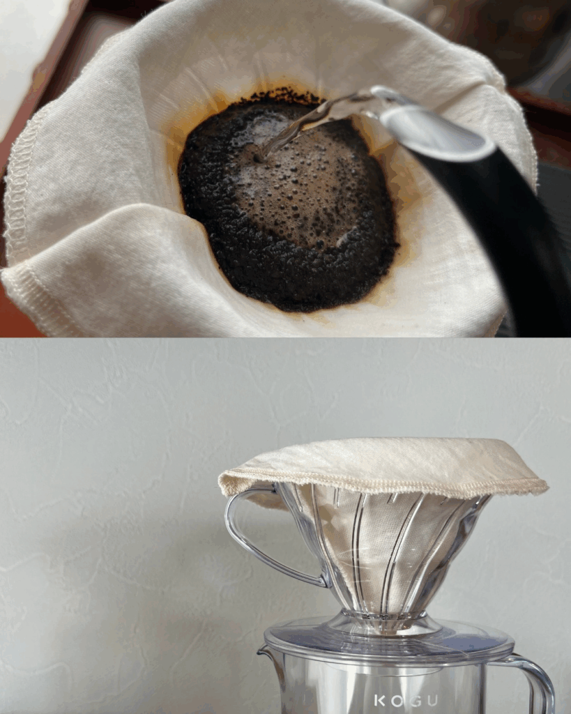 ao様製、やわらかなガーゼ生地で作った特別なドリッパーを使い、ハンドドリップコーヒーをご提供いたします。