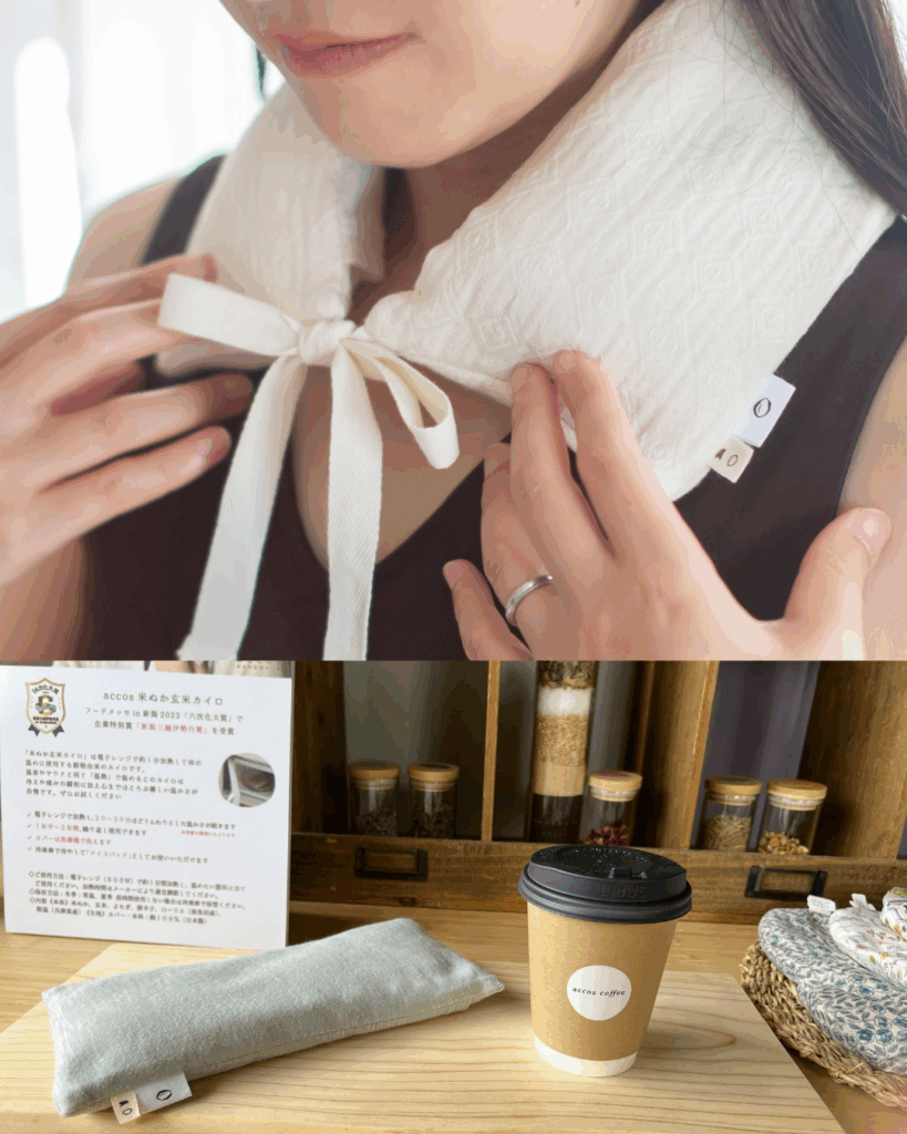 さらに、ao × accos コラボレーションの米ぬか玄米カイロも販売、ふんわり心も体も温まるアイテムを、この機会にぜひ手に取ってみてください。